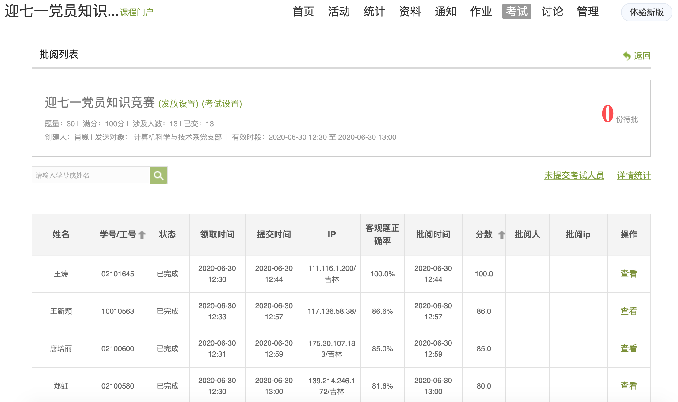 (撰稿人:肖巍)为深入学习贯彻习近平新时代中国特色社会主义思想和党的十九大和十九届二中、三中、四中全会精神,为纪念中国共产党成立99周年,巩固和拓展“不忘初心、牢记使命”主题教育成果,进一步提升基层党组织的凝聚力和战斗力,激发各级党组织和广大党员在脱贫攻坚、疫情防控、特色高水平应用研究型大学建设等各项工作中充分发挥战斗堡垒和先锋模范作用,计算机科学与技术系党支部和实验中心与办公室联合党支部于2020年6月30日12:30-13:00在超星学习通钟联合举办了网络答题知识竞赛活动。