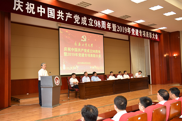 党委副书记孟雷宣读《关于表彰2019年党建专项工作先进集体和优秀个人的决定》,对“对标争先”计划“标杆院系”“样板支部”和“双实双进”工程优秀建设单位、优秀特色项目、优秀党员示范岗等先进集体和优秀个人进行专项表彰。
