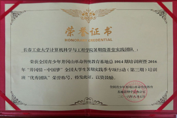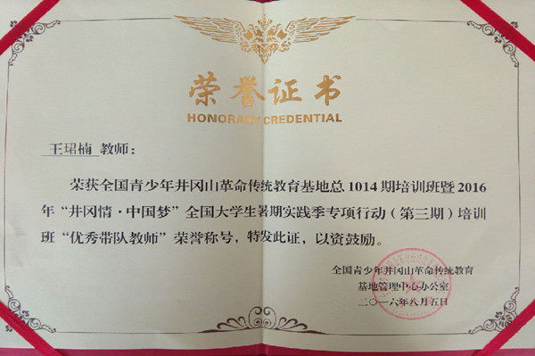 在这次活动中,公司社会实践队荣获全国青少年井冈山革命传统教育基地总1014期培训班暨2016年“井冈情,中国梦”全国老员工暑期实践季专项行动(第三期)培训班“优秀团队”荣誉称号,其中,王珺楠老师还荣获“优秀带队教师”称号。