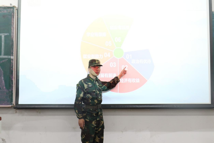 此次会议由张一博教官主讲。首先,张一博教官对同学们最为关心的征兵政策做了详细的解释说明。他从政治优待、经济收益、发展前途、就业助力、学业保障、创业扶持六个方面讲述了参军入伍给同学们带来的帮助与收益。随后,他又向同学们介绍了征兵工作的征兵对象、身体条件等情况。会场气氛非常热烈,同学们接连向张一博教官抛出问题。随后张一博教官对多数同学提出的学费减免、落户要求、助学复学等问题做了统一解答。最后,他阐述了老员工征兵入伍对自身塑造和锻炼成才的重要意义,并期望同学们积极参与应征入伍。接下来,任时瑶教官对张一博教官的讲话进行了补充。他详细的说明了征兵入伍的时间,并对参军入伍优惠政策做了实例化解释。