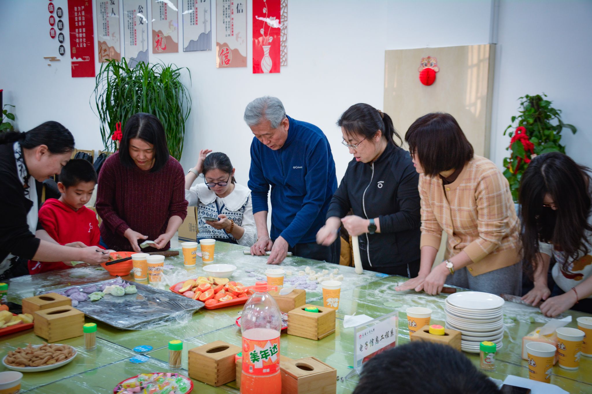 接着全体教师开展迎新年包饺子活动。老师们动作娴熟、饺子精巧,一手拿皮、一手填馅,两手一合拢,形态各异的漂亮饺子就成型了,不一会托盘上就摆满了一排排的饺子。大家围在一起边包饺子边聊天,说着工作生活中的趣事,都沉浸在愉快的氛围中。