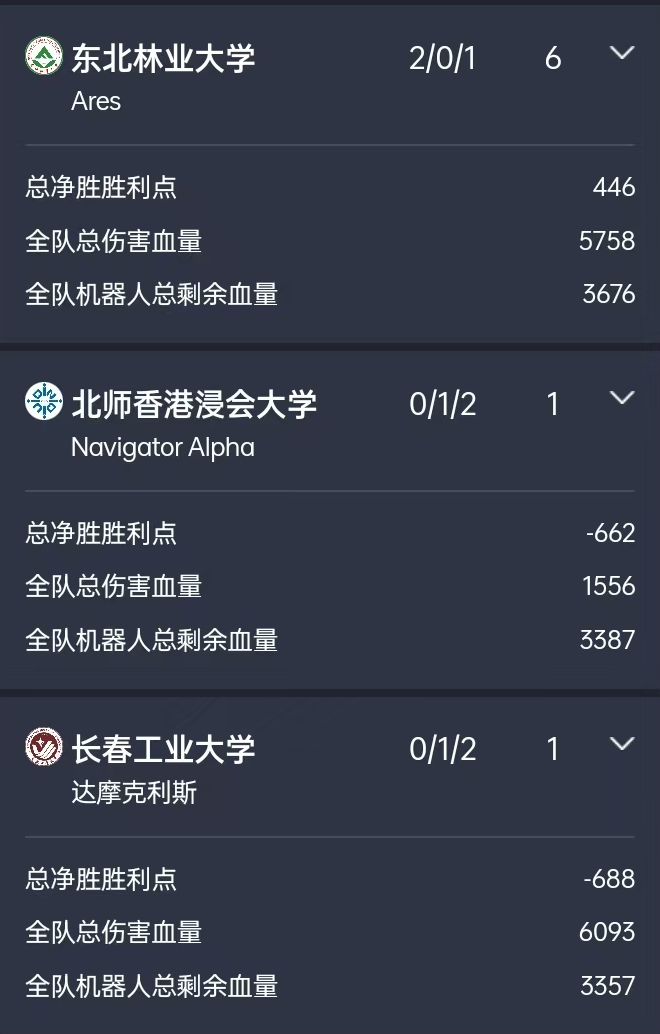 在3V3对抗赛中,战队展现出惊人的战斗力,全队总伤害输出达到6093点。这一数据不仅创造了战队历史新高,更超越了上赛季冠军东北林业大学的伤害记录,标志着战队在火力系统优化和战术执行能力上实现了质的飞跃。通过精准的弹道控制算法改进和高效的团队配合策略,战队在伤害输出效率方面取得了突破性进展,为最终斩获国家级三等奖奠定了坚实基础。