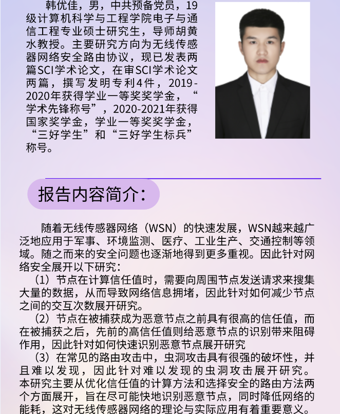“后起之秀”——无线传感器网络安全路由协议研究 主讲人:韩优佳 时间:2021年11月26日 15:00 |