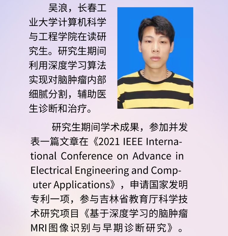 “后起之秀”——基于UNet++的权值预算脑肿瘤分割 主讲人:吴浪 时间:2021年11月5日 15:00 |