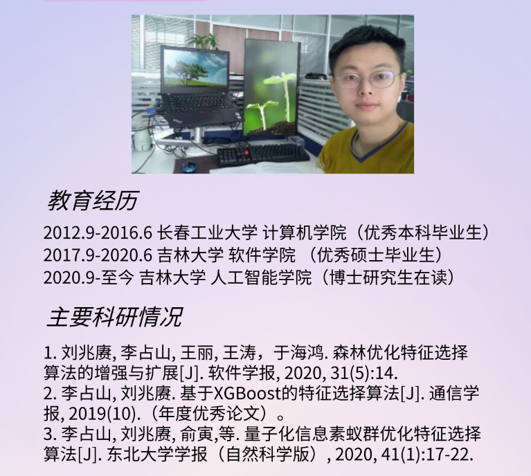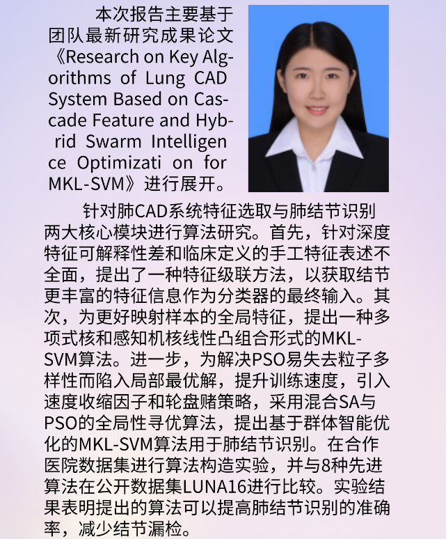 “后起之秀”——Research on Key Algorithms of Lung CAD System Based on Cascade Feature and Hybrid Swarm Intelligence Optimization for MKL-SVM 主讲人:常佳乐 时间:2021年11月5日 14:00 |