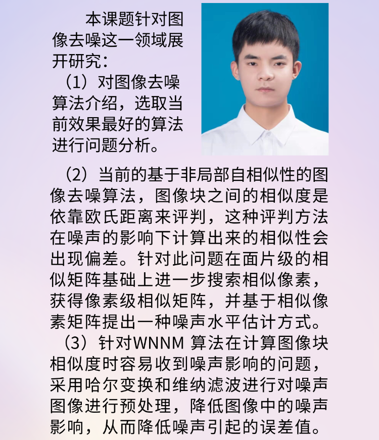 “后起之秀”——基于非局部自相似性的图像去噪算法研究 主讲人:许连杰 时间:2021年11月26日 16:30 |